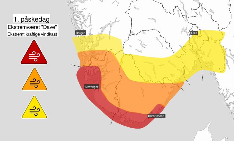 Meteorologisk institutt har sendt ut varsel om at ekstremvêret "Dave" rammar delar av Rogaland sundag 1. påskedag. Det er varsla vindkast på raudt nivå - ekstremt kraftige vindkast.