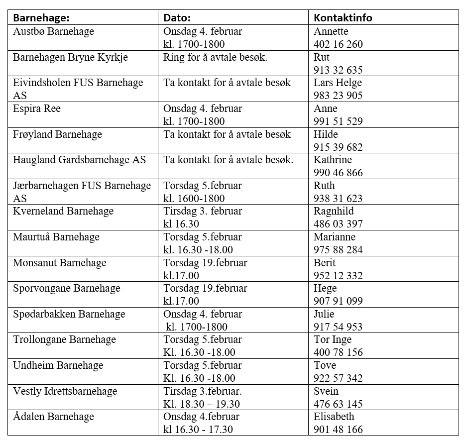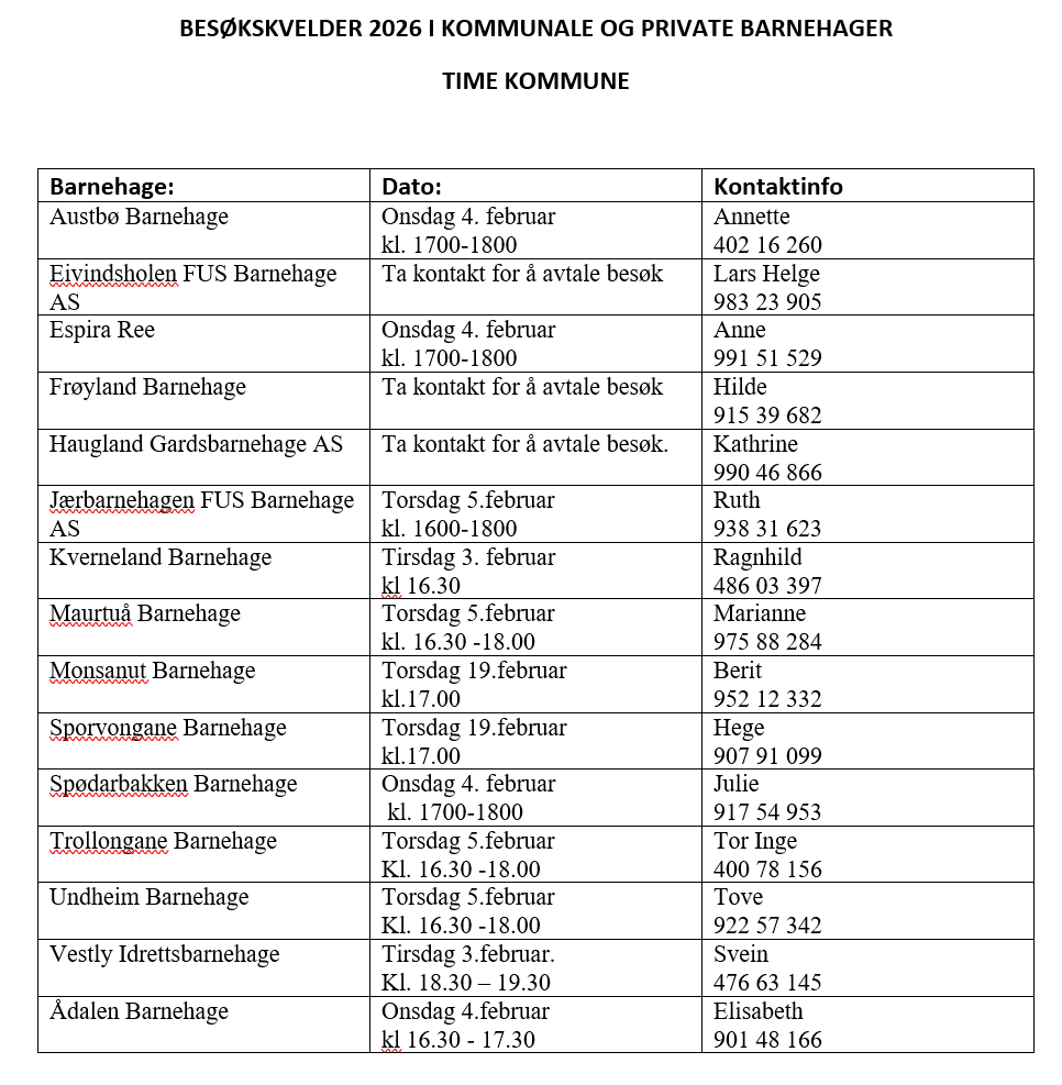 Barnehagane i Time kommune ønsker nye søkarar velkomne på besøk for å sjå barnehagen sine lokale, og for å få svar på spørsmål som ein måtte ha.