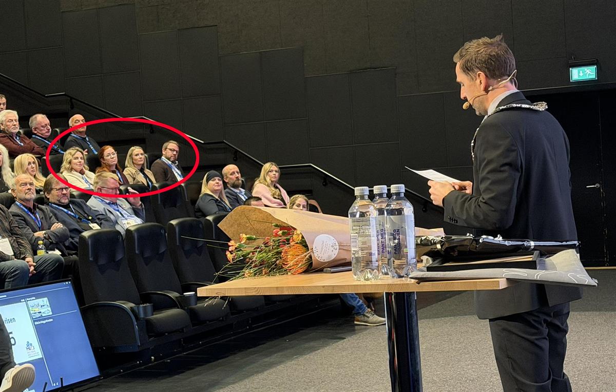 Dei utsende frå Hotell Jæren høyrer på idet Andreas Vollsund les opp grunngjevinga for utdelinga av prisen.