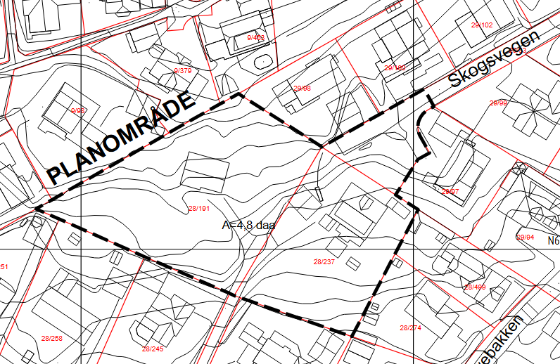 Planområdet omfattar eigedommane gnr. 28 bnr. 191 og 237, samt offentleg leikeplass og snuhammar i enden av Skogsvegen. På eigedommane i dag er det eldre frittliggjande bustader som er planlagt reve. Utklippet nedanfor synar ny planavgrensing: