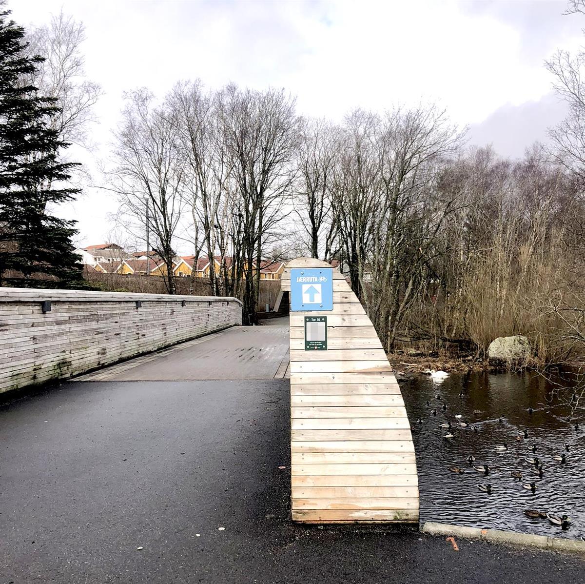 Sykkelturen går over brua til Sandtangen og følger lysløypa nordover til den 230 meter lange trebrua Midgardsormen som kryssar Frøylandsvatnet. Du syklar over brua, tek kanskje ein liten stopp i gapahuken, og fortset opp bakken til vegkrysset. Her kan du velja høgre eller venstre, men turen tek uansett av frå lysløypa og vidare på turvegen i retning Siribu.