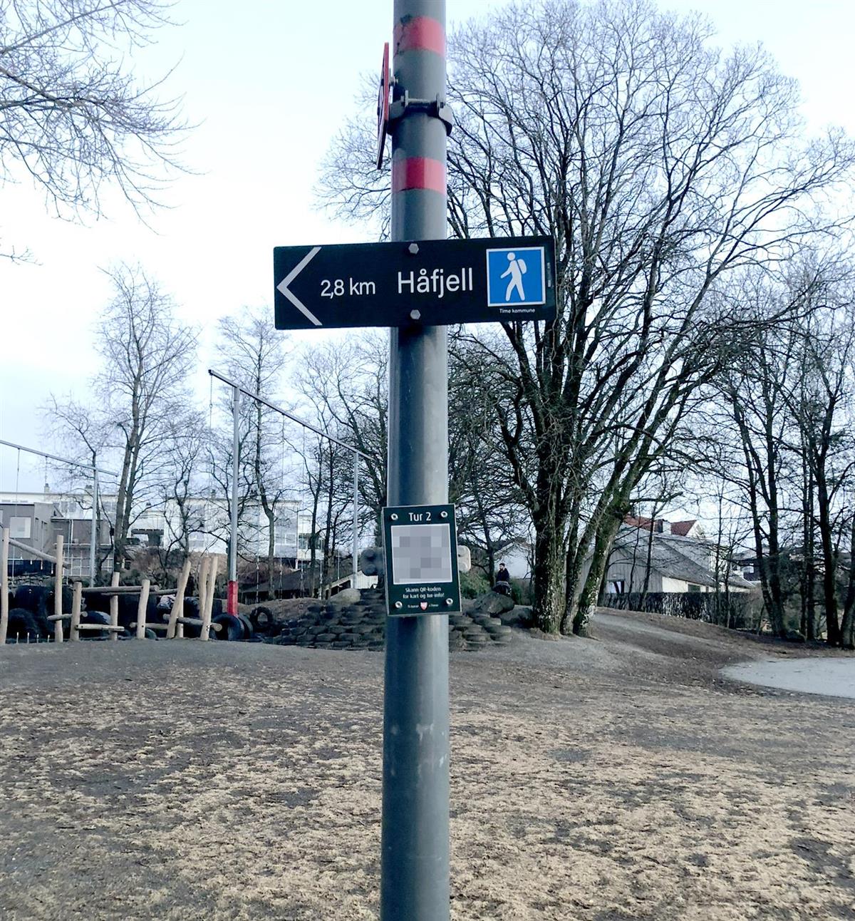 Skiltet med QR-koden for nedlasting av løypa er plassert på en lyktestolpe like ved Tarzanløypa, der turen startar.