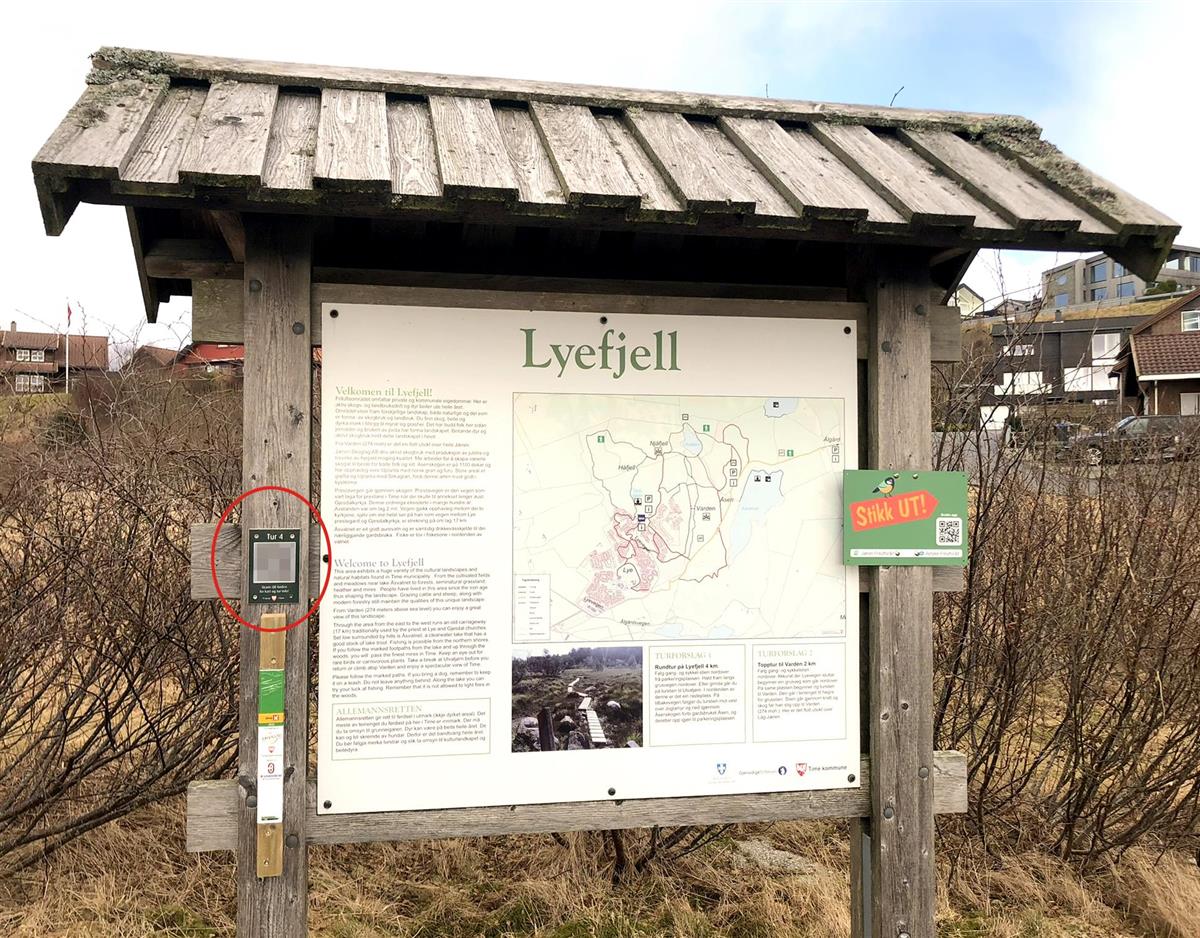 Skiltet med QR-koden for nedlasting av løypa er plassert på oppslagstavla i øvre enden av parkeringsplassen.