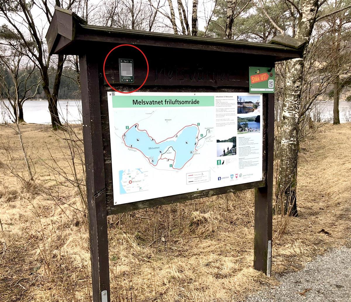 Skiltet med QR-koden for å lasta ned løypa er plassert på oppslagstavla på parkeringsplassen, i nærleiken av der du køyrer inn.