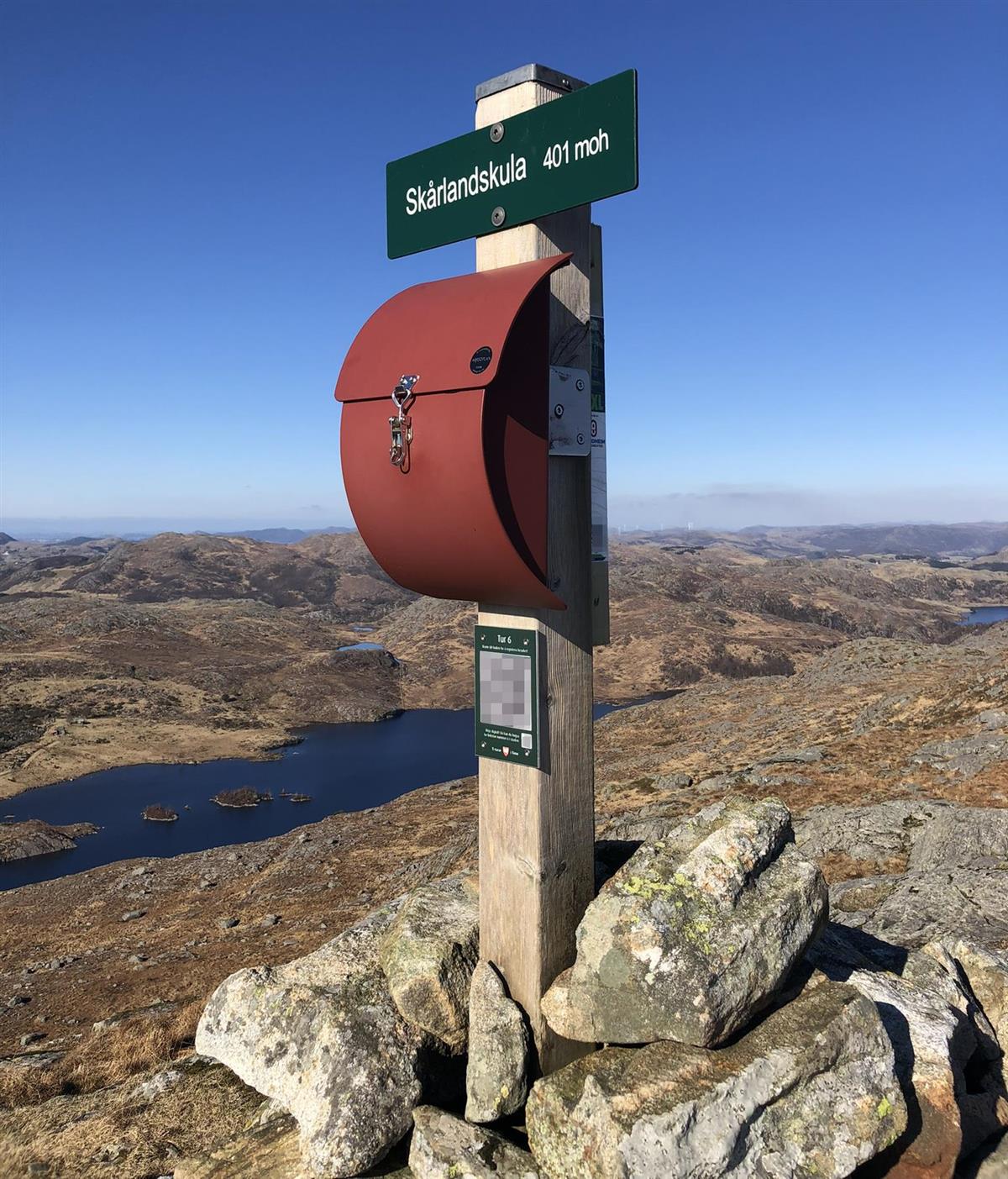 Vår tur går i utgangspunktet frå parkeringsplassen over utmark og så bak hytta som ligg ved vatnet, før løypa går vidare på traktorveg mog i retning Lauvlia. Når du passerer gjerdet som går i nordkant av Snorestadtjørnane tek løypa mot Skårlandskula til høgre. Herifrå og til toppen stig terrenget med nesten 200 høgdemeter, og løypa er godt merka. QR-koden for registrering av turen finn du på stolpen på toppen, på 401 meters høgde, med storslått utsikt.